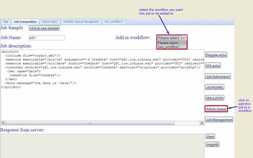 In previous implementation, I separated jobs from workflows. A job is a small task which currently is written in Karajan workflow language. Here, it is kind of confusing. Karajan workflow language is used to represent a job. A workflow consists of jobs number of which is variable. A workflow queue consists of some workflows. Workflows in a workflow queue can be executed in arbitrary order, which means that these workflows are totally independent. However, jobs in a workflow are usually related so that they should be executed in a certain order. Essentially workflow queue and workflow do not have fundamental difference because we can convert between them. So, difference is in logical level.