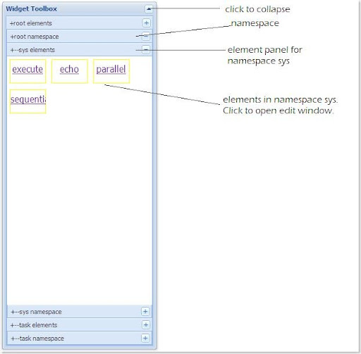 The panel is organized according to namespaces. So if user knows the namespace of an element, it is effortless to find the corresponding widget in the toolbox. And all main panels structured into accordion layout. If user clicks the title bar of a panel, that panel is expanded and all other panels are collapsed.