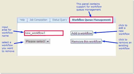 In previous implementation, I separated jobs from workflows. A job is a small task which currently is written in Karajan workflow language. Here, it is kind of confusing. Karajan workflow language is used to represent a job. A workflow consists of jobs number of which is variable. A workflow queue consists of some workflows. Workflows in a workflow queue can be executed in arbitrary order, which means that these workflows are totally independent. However, jobs in a workflow are usually related so that they should be executed in a certain order. Essentially workflow queue and workflow do not have fundamental difference because we can convert between them. So, difference is in logical level.